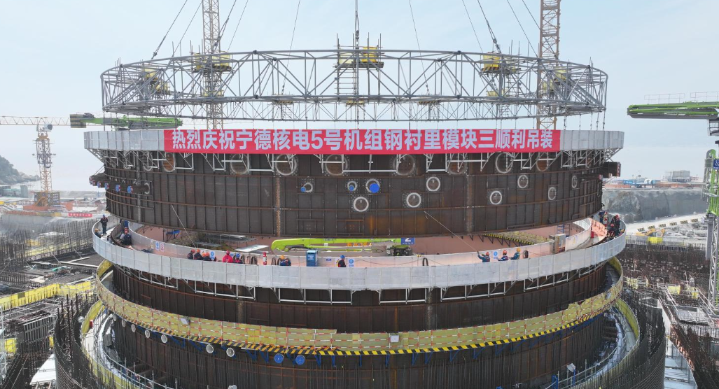 ??2025年3月1日,中廣核福建寧德核電項(xiàng)目二期工程5號(hào)機(jī)組BRX廠房鋼襯里模塊三自12時(shí)00分起吊,經(jīng)過起鉤、旋轉(zhuǎn)、變幅、下落等動(dòng)作后,于13時(shí)08分順利吊裝就位,歷時(shí)68分鐘,標(biāo)志著寧德核電5號(hào)機(jī)組又一個(gè)重要節(jié)點(diǎn)順利實(shí)現(xiàn)。